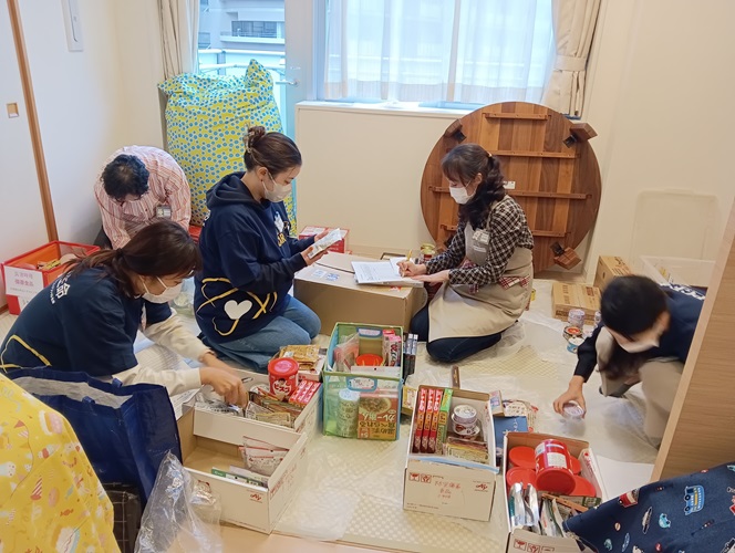 この日は、防災備蓄食品の棚卸しを行いました。ファミリーハウスでは、各ハウスで災害時3日間凌げる水や食品、また防災用品を備えています。賞味期限や在庫数を丁寧に確認し、ご寄付の食品をローリングストックをしながら、非常時に備えています。期限の異なる食品を管理していくには、かなりの手が必要ですが、皆様のご協力のお陰で、勝どき・築地地域の今年の棚卸しを完了する事ができました。
