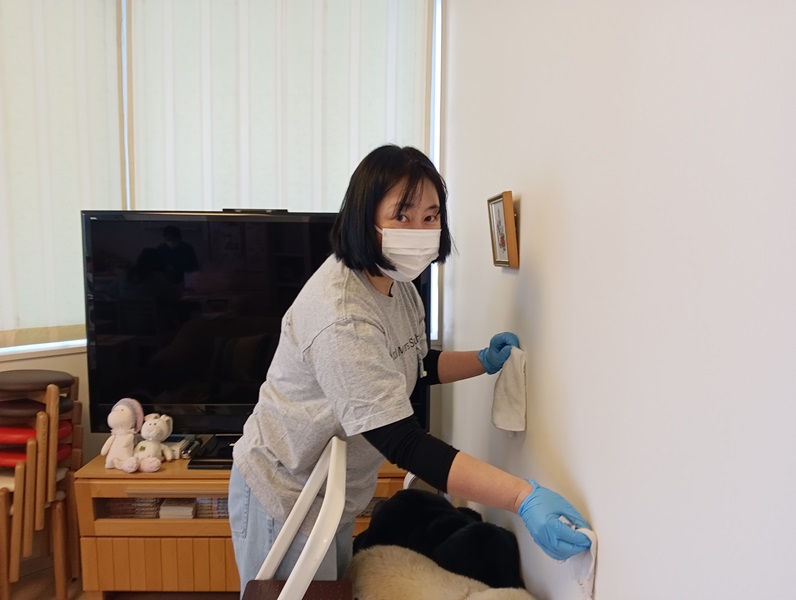 この日は、ハウスを見学いただいた後、通常のハウスの清掃の他に、玄関のたたき・戸棚の中・壁や床などの清掃、倉庫の整理、ノロセット※の入れ替えなど、多岐にわたる活動にご協力いただきました。ご協力のおかげで、普段は人数が少なく中々手が回らないところまで丁寧に整えることができ、ハウスがより衛生的で整った環境で利用者をお迎えできるようになりました。ご協力に、心より感謝いたします。